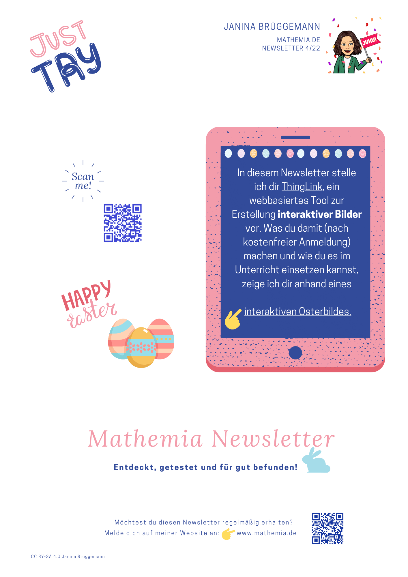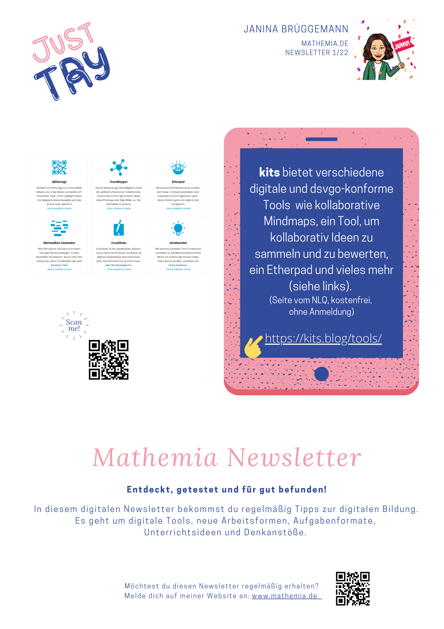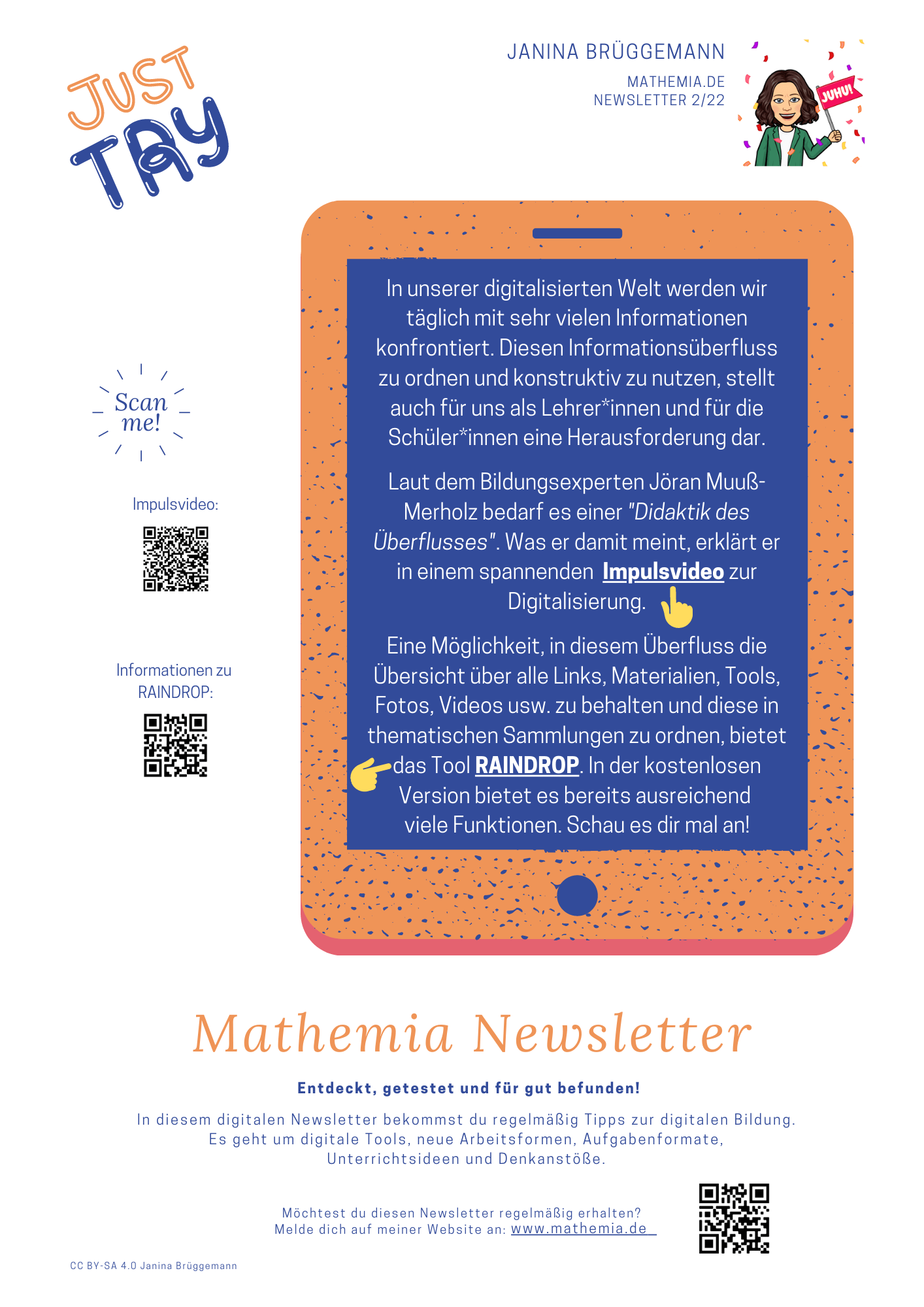 Im Mathemia Newsletter gebe ich Tipps zur digitalen Bildung. Es geht um digitale Tools, neue Arbeitsformen, Aufgabenformate, Unterrichtsideen und Denkanstöße. Der Newsletter ist nicht speziell für das Fach Mathematik gedacht, sondern fächerübergreifend. Alle bereits erschienenen Ausgaben können hier eingesehen und downgeloadet werden.